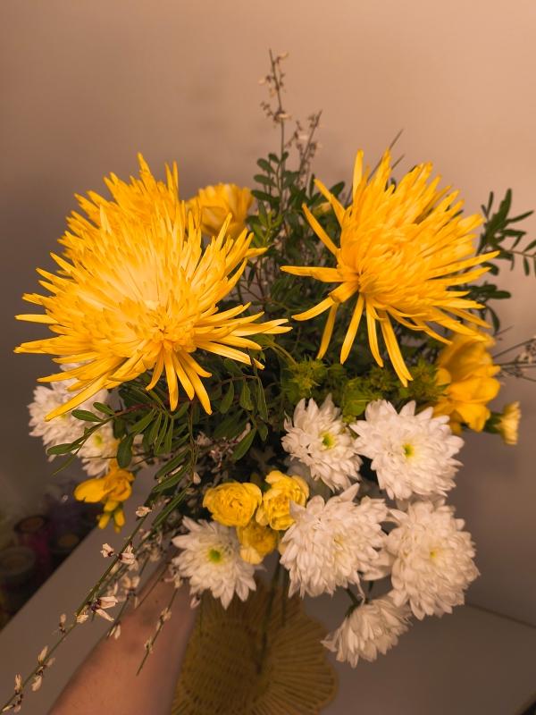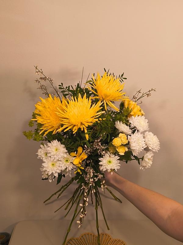 A cheerful blend of yellow, white, and cream blooms, bringing a soft burst of sunshine to any space. With its warm tones, this bouquet feels fresh, uplifting, and effortlessly sweet.